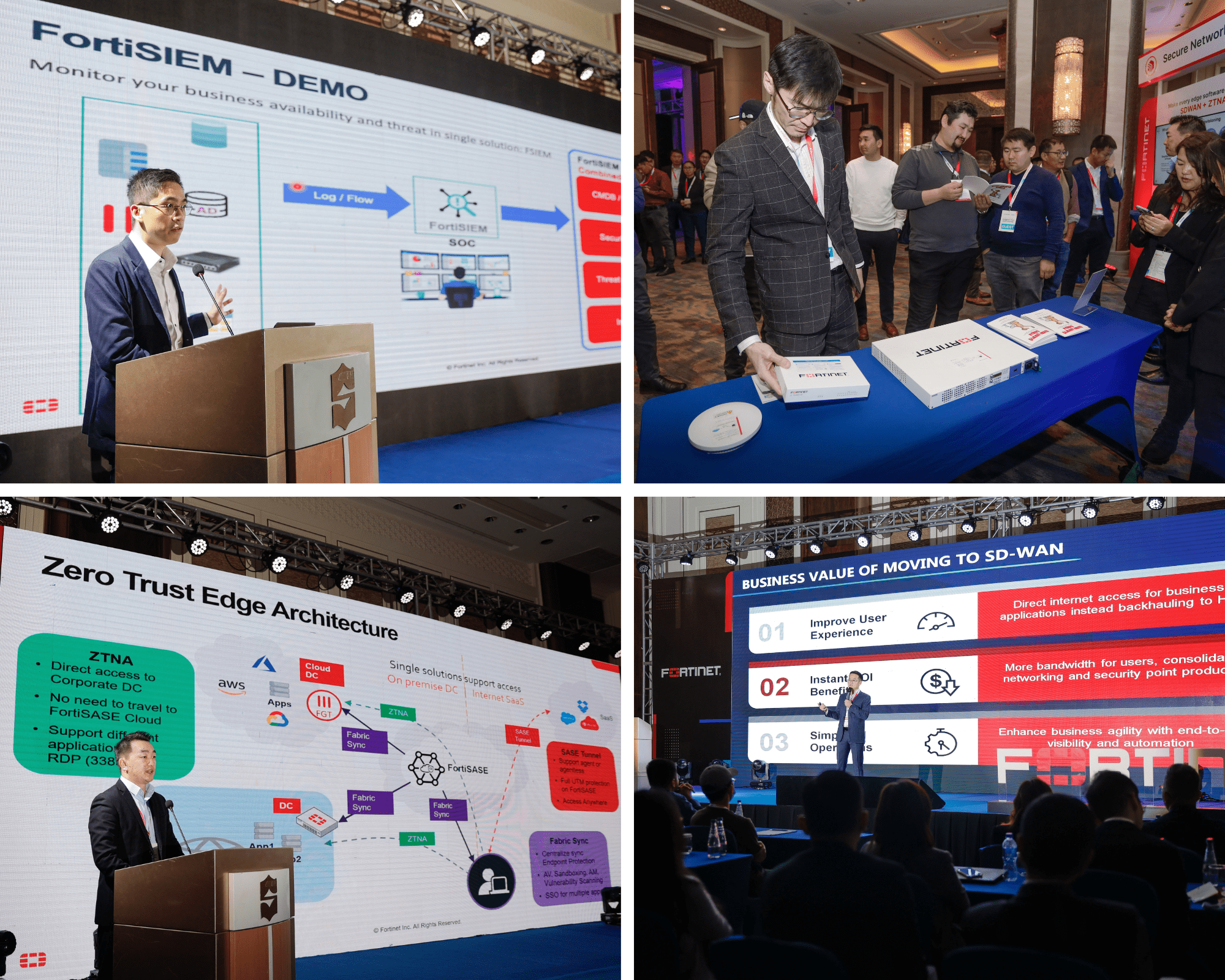 Secure Anywhere буюу хаанаас ч аюулгүй хандаж ажиллах боломжийг олгох SDWAN, SASE, ZTNA технологиуд болон аюулгүй байдлыг өндөр түвшинд real-time хянах боломжтой FortiSIEM зэрэг шийдлүүд байснаас гадна мэргэжлийн судалгааны байгууллагын тайлан, олон улс дахь кибер аюулгүй байдлын амжилттай туршлага зэргийг онцлон танилцуулсан.