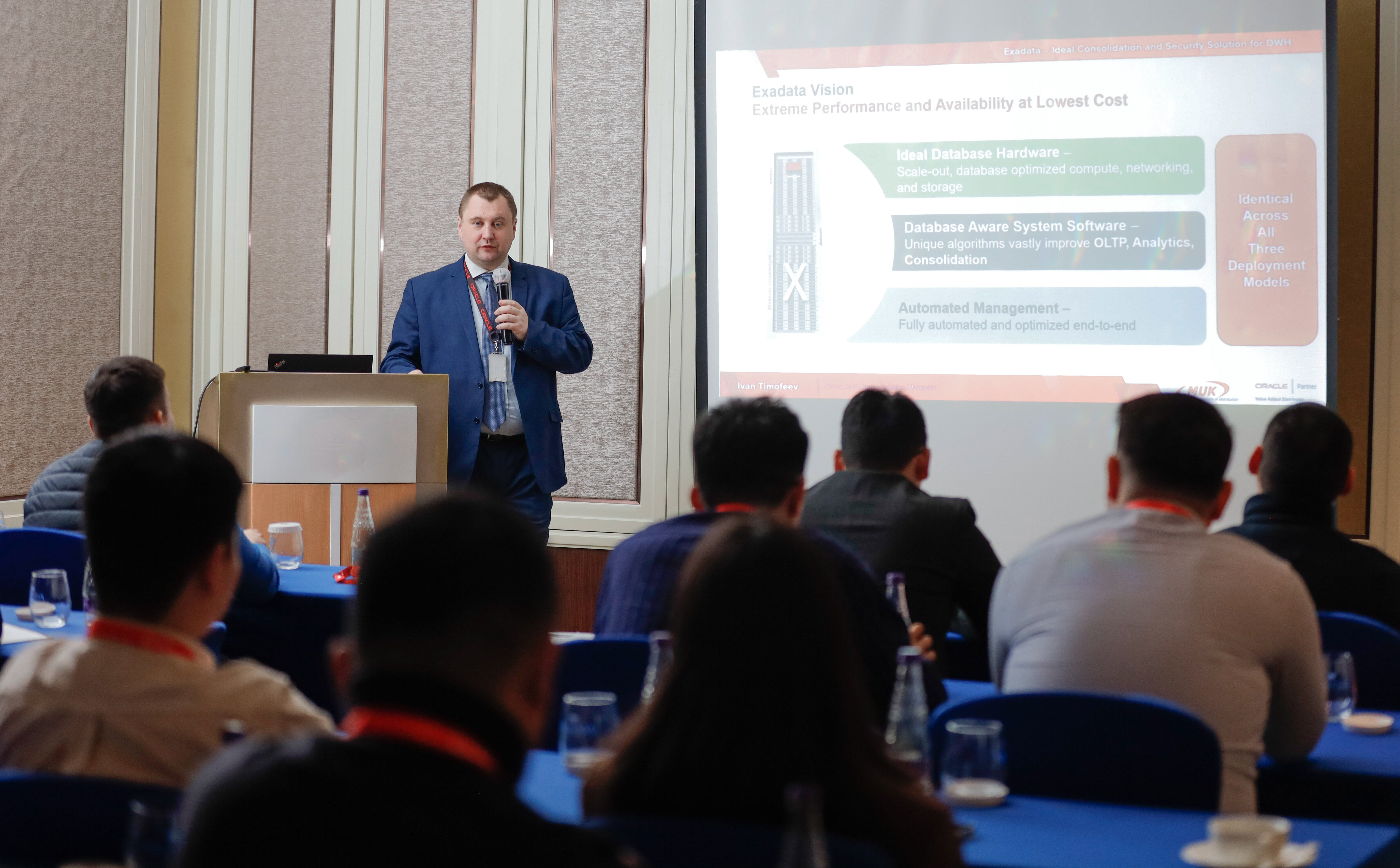 Арга хэмжээний үеэр Oracle компанийн технологийн эксперт Ivan Timofeev “Oracle Exadata Database Machine X9M ” буюу Oracle database ажиллах хамгийн шилдэг орчин, Oracle-ийн бүрэн инженерчлэгдсэн систем болох Oracle Exadata machine-ийн сүүлийн үеийн загварын онцлог давуу талууд, өмнөх загваруудаас онцлох технологийн сайжруулалтын талаар харилцагчдад илтгэл танилцуулсан.
